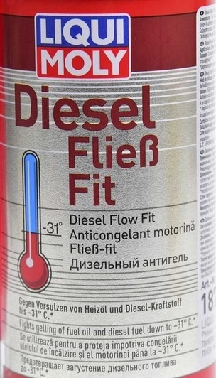 Liqui Moly Diesel Fliess-Fit АНТИГЕЛЬ прекрасно підходить для будь-якого виду дизельного палива. Перешкоджає кристалізації парафіну в дизпаливі в зимову пору року і засмічення фільтрів. Підходить для автомобілів з різним типом дизельних двигунів, включаючи турбодвигуни, без каталізатора, що не мають фільтрів сажі. Завдяки використанню даної рідини, паливо починає замерзати починаючи з температури -31°С.