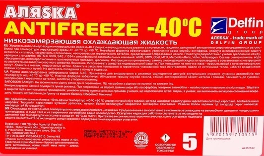 Готовий антифриз АЛЯSКА -40 G12 червоного кольору - низкозамерзающая охолоджуюча рідина для двигунів внутрішнього згоряння. Чи відповідає специфікаціям автомобілів компаній AUDI, VW, OPEL, BMW, MTU, VOLVO. Відповідає стандарту G12