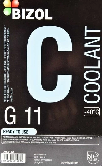 Готова для використання охолоджувальна рідина Bizol -40 G11 призначена для цілорічного застосування. Може застосовуватись, зокрема, у сільськогосподарській та будівельній техніці. Гарантує безпеку під час кермування. Вона не агресивна до алюмінію, до гумових і пластикових деталей системи. Не містить нітритів, фосфатів, амінів. Може змішуватися з будь-якими антифризами класу G11.