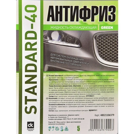 Готовий антифриз Дорожня Карта Standard -40 зеленого кольору використовується для охолодження двигуна внутрішнього згоряння і захисту системи охолодження від корозії.