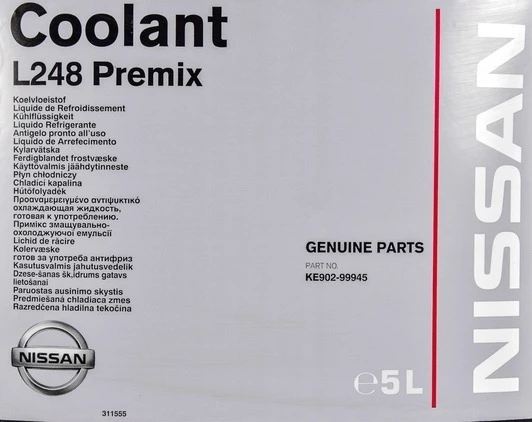 Антифриз Nissan / Infiniti Coolant L248 Premix G11 зелений виготовлений на основі етиленгліколю з застосуванням спеціалізованих добавок, які допомагають продукту тримати постійну робочу теплоємність і оберігати мотор з системою охолодження від перегріву.