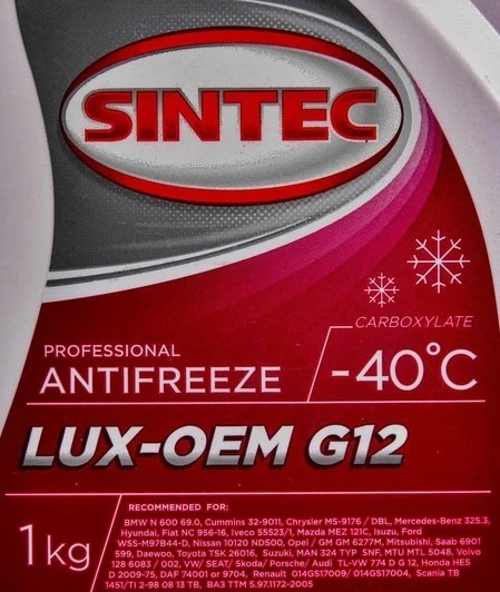 Синтек Люкс G12 випускається з пакетом присадок на карбонової основі. Продукти цього типу розробляються насамперед для машин з алюмінієвими деталями двигуна. Lux G12 має допуски-схвалення від Volkswagen, Автоваз, Камаз, BMW і Mercedes-Benz.