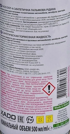 Синтетична гальмівна рідина XADO (Україна) відноситься до класу DOT 4 і по некор показниками перевершує його вимоги. Подтверженное якості даної рідини є специфікації провідних автовиробників (BMW, VW, MAN).