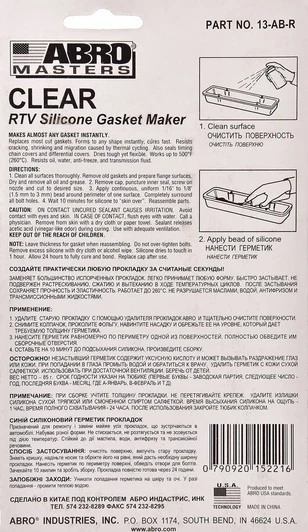Герметики ABRO випускаються в широкій колірній палітрі і для різноманітних потреб: силіконові герметики для прокладок, для системи випуску ОГ, для оливноъ системи, для вклеювання стекол, фіксатори різьби та ін. Стійкі до впливів олив, антифризу, бензину, води і гальмівної рідини.