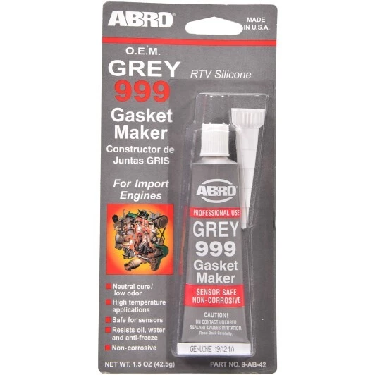 Сірий формувач прокладок АБРО ОЕМ 999 пластичний, легкий і еластичний, а також безпечний для всіх видів металів. Найчастіше його застосовують для лагодження кришки картера трансмісії; посилення герметичності корпусу термостата; герметизації впускного колектора і інших деталей автомобіля.