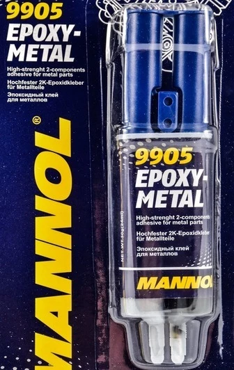Двокомпонентний клей Mannol Epoxy-Metal створений на основі епоксидної смоли і є незамінним для швидкого склеювання деталей з різних матеріалів. Однак даний склад більшою мірою орієнтований на сплави металів і широко застосовується для ремонту елементів автомобільних механізмів. Суміш вологостійка і твердне навіть в умовах дуже високої вологості. Повністю просохлої клей вкрай стійкий до хімічних і механічних впливів. Стійкість до нагрівання - до 150 ° С.
