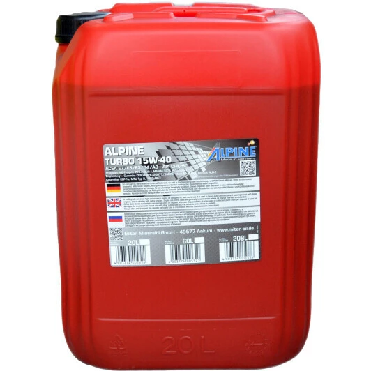Мінеральна моторна олива Alpine Turbo 15w-40 спеціально створена для всесезонного використання у високонавантажених дизельних двигунах (з турбонаддувом або без) вантажних та легкових автомобілів. Також може використовуватись у низці бензинових моторів.