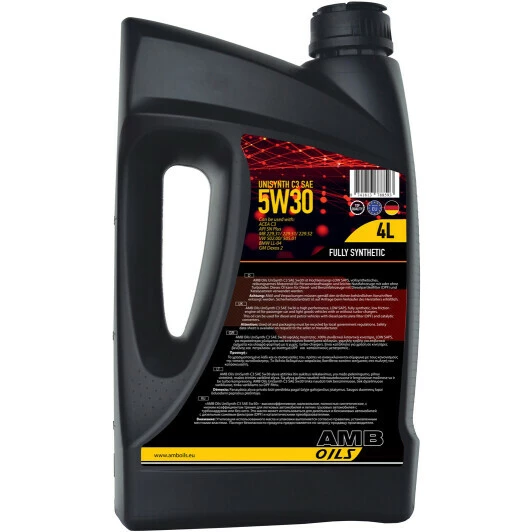 AMB UniSynth C3 5w-30 – повністю синтетична моторна олива з енергоощадними властивостями, розроблена для сучасних бензинових та дизельних двигунів, у тому числі з турбонаддувом. Підходить для використання у легкових автомобілях зі збільшеним інтервалом між замінами оливи.
