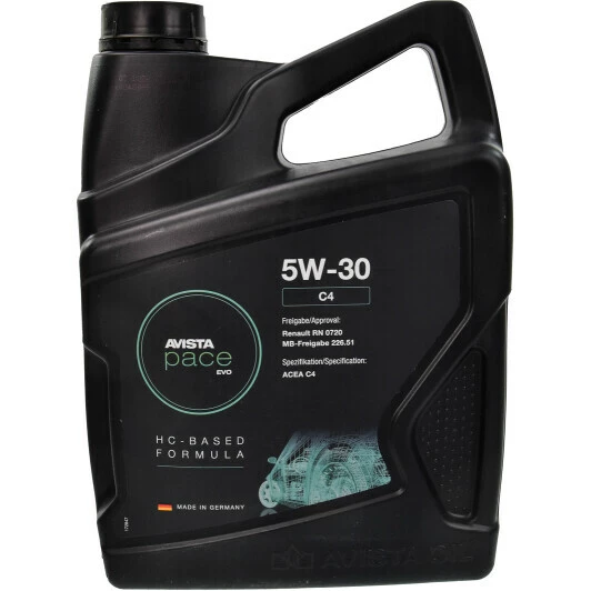 Моторна олива AVISTA Pace EVO C4 5W-30 призначена для дизельних і бензинових двигунів з турбонаддувом або без нього, обладнаних сучасними системами додаткового очищення викидних газів, про що свідчить категорія ACEA C4. Продукт відповідає екологічним вимогам Euro-4 і підходить для двигунів, яким необхідний знижений вміст сульфатних зол, сірки та фосфору. Має допуски Mercedes Benz, Chrysler, Dodge, Jeep і Renault.