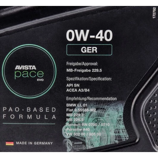 Моторна олива AVISTA Pace EVO GER 0W-40 для високопотужних дизельних та бензинових ДВС має відмінні диспергуючі та миючі властивості.