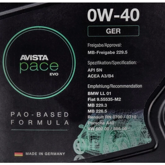 Моторна олива AVISTA Pace EVO GER 0W-40 для високопотужних дизельних та бензинових ДВС має відмінні диспергуючі та миючі властивості.
