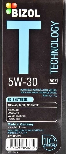Bizol Technology 507 5W-30 - універсальна синтетична моторна олива німецького виробництва з подовженим терміном її заміни. До складу оливи входять сучасні комплекти присадок.