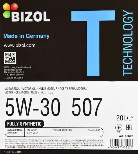 Bizol Technology 507 5W-30 - універсальна синтетична моторна олива німецького виробництва з подовженим терміном її заміни. До складу оливи входять сучасні комплекти присадок.