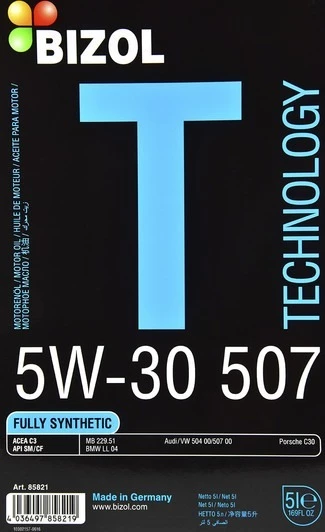 Bizol Technology 507 5W-30 - універсальна синтетична моторна олива німецького виробництва з подовженим терміном її заміни. До складу оливи входять сучасні комплекти присадок.