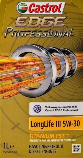 Моторна олива Castrol Professional EDGE Titanium Longlife 3 VW 5W-30 синтетична розроблена для форсованих дизельних та бензинових двигунів.