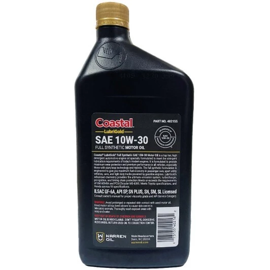 Повністю синтетична моторна олива Coastal Lubrigold 10W-30 – високоякісний мастильний матеріал, призначений для бензинових двигунів сучасних легкових автомобілів і кросоверів. Придатна для новітніх двигунів із турбонаддувом, безпосереднім упорскуванням пального і системою зміни фаз газорозподілу.