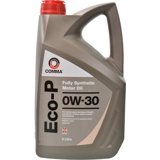 Comma Eco-P 0W-30 - синтетична олива зі зниженим вмістом зольних домішок, що уможливлює її застосування в автомобілях із каталітичними нейтралізаторами і сажовими фільтрами. Зберігає текучість за температури до -35 градусів. Вироблена на оливній основі, отриманій із природного газу шляхом промислового синтезу. Призначена для автомобілів PSA-group і двигунів PureTech і BlueHDi.