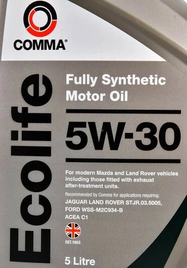 Comma Ecolife 5W-30 - високоякісна, повністю синтетична малозольна моторна олива, розроблена спеціально для низки автомобілів Mazda, Land Rover, Jaguar, Ford, Mitsubishi.