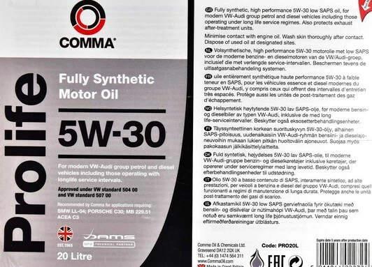 Comma Prolife 5W-30 - олива з показником Low SAPS, розроблена для автомобілів концерну Фольксваген-Ауді.