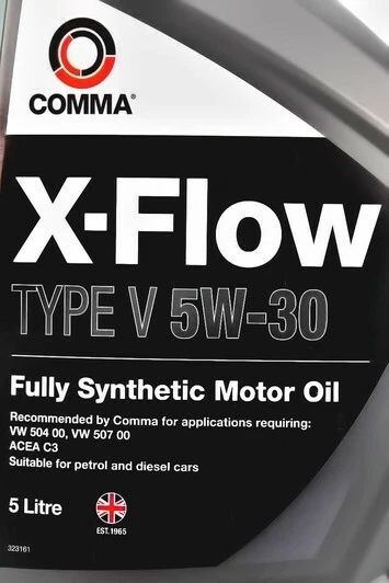 Comma X-Flow Type V 5W-30 - високоякісна, повністю синтетична моторна олива, розроблена спеціально для низки автомобілів Volkswagen-Audi. Вона отримала допуски від VAG, що уможливило її застосування в бензинових і дизельних моторах Volkswagen, Seat, Skoda, Audi, де передбачений збільшений сервісний період із заміни оливи.