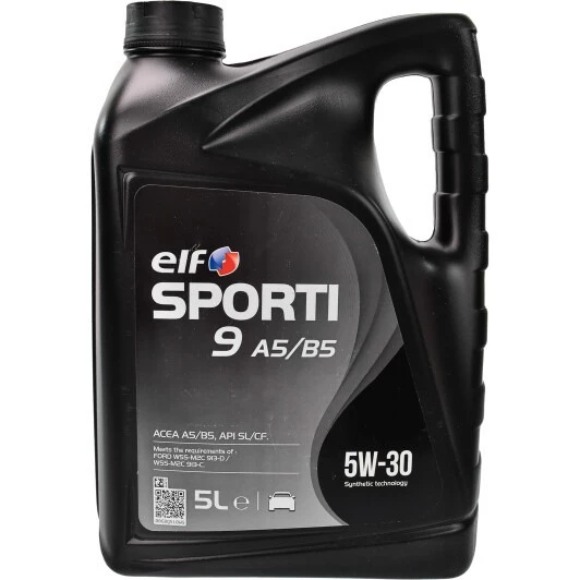 Розроблене для бензинових і дизельних двигунів моторну оливу Elf Sporti 9 A5 / B5 5W-30 синтетичне передбачає використання в легковому і легкому комерційному транспорті. Стабільна в'язкість при високих температурах дозволяє використовувати продукт в режимі екстрених навантажень, таких як гоночні змагання. Крім того, масло прекрасно показує себе в турбированних двигунах і агрегатах, оснащених каталітичними нейтралізаторами. В'язкість також залишається стабільною в умовах низьких температур, дозволяючи знизити зношування двигуна при холодному пуску.