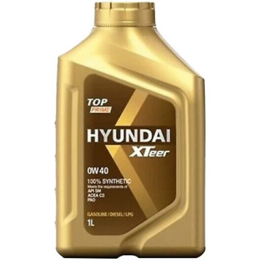 Синтетична моторна олива Hyundai XTeer TOP Prime 0w-40 призначена для високопотужних бензинових двигунів та дизельних двигунів з прямим упорскуванням. Може використовуватись у легкових автомобілях, а також у легкому комерційному транспорті. Асоціацією Європейських виробників автомобілів продукту привласнено специфікацію ACEA A3/B4, B3, C3, яка серед інших характеристик вказує на сумісність з фільтрами сажі. Олива виготовляється за технологією Mid SAPS, і знижений вміст сполук фосфору, сірки, а також сульфатних зол зменшує кількість вогнетривких частинок у вихлопі, які призводять до раннього виходу з ладу систем доочищення газів.