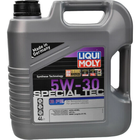 Liqui Moly Special Tec B FE 5w-30 – це всесезонна моторна олива з синтетичним складом, призначена насамперед для бензинових моторів автомобілів BMW (починаючи з 2002 року випуску) без фільтра сажі, а також для деяких моделей BMW M. Продукт протестований на двигунах з турбонаддувом та каталітичним нейтралізатором.