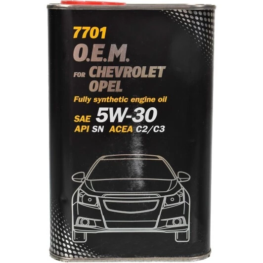 Mannol O.E.M. For Chevrolet Opel (Metal) 5w-30 – універсальна синтетична моторна олива, призначена для бензинових та дизельних (включаючи турбовані) двигунів легкових автомобілів, кросоверів і навіть легких вантажівок. Склад був розроблений відповідно до низки ОЕМ-допусків таких автомобілебудівних компаній, як OPEL, Chevrolet, SAAB, Fiat, GM, VW, DAEWOO, Renault, Peugeot, Citroen та інших.