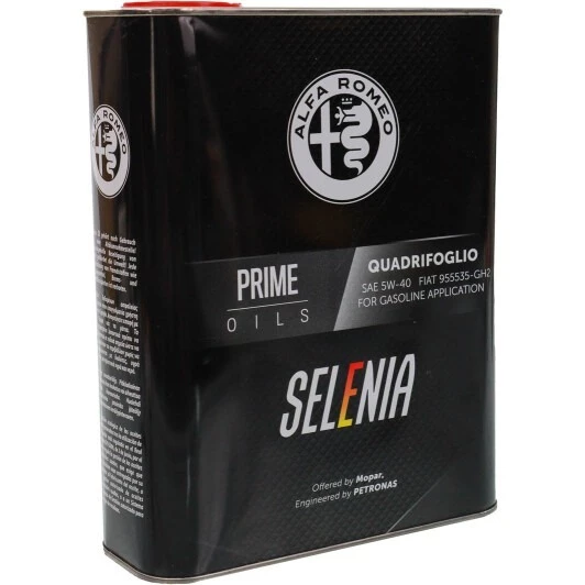 Petronas Selenia Quadrifoglio 5W-40 – преміальна, повністю синтетична моторна олива, створена у співпраці з концерном FCA спеціально для високопродуктивних бензинових двигунів автомобілів Alfa Romeo Giulia Quadrifoglio. Її формулу розроблено з урахуванням особливостей експлуатації двигуна в умовах екстремальних навантажень, що забезпечує стабільну й ефективну роботу мотора на високих обертах.