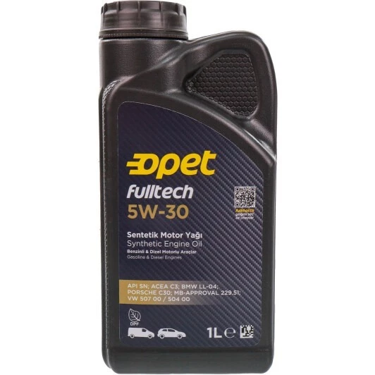 Opet Fulltech 5W-30 – це синтетична моторна олива, рекомендована для сучасних бензинових та дизельних двигунів легкових автомобілів та легкої комерційної техніки. Особливо підходить для використання в автомобілях таких марок як Mercedes-Benz, BMW, Volkswagen. Завдяки спеціальній формулі олива сумісна з системами доочищення вихлопних газів, зокрема з дизельним фільтром сажі (DPF) і трикомпонентним каталітичним нейтралізатором (TWC).