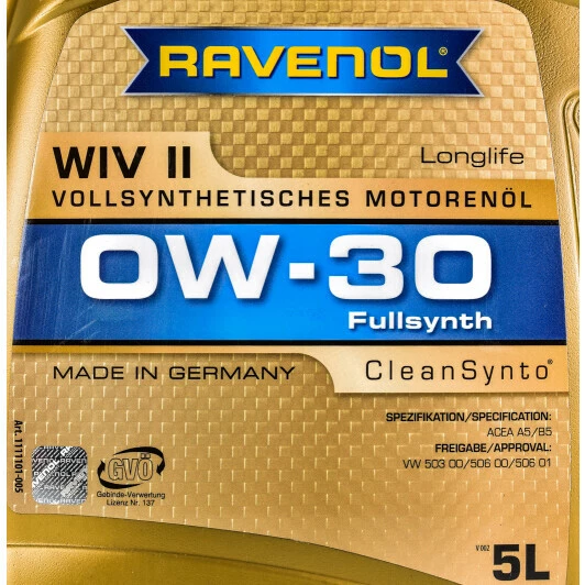 Ravenol WIV ІІ 0W-30 - синтетична олива , розроблене для двигунів автомобілів VW, Audi, що працюють на дизелі і бензині. Завдяки його постійному використанню зменшується тертя елементів двигуна, економніше витрачається паливо, тому дана продукція - кращий вибір для транспорту з подовженим інтервалом заміни масла.