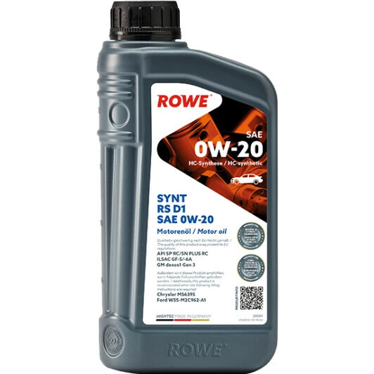 Rowe Synt RS D1 0W-20 — синтетична моторна олива для бензинових двигунів нового покоління, зокрема малолітражних, турбованих і з прямим упорскуванням для надійного запобігання їх характерним проблемам.
