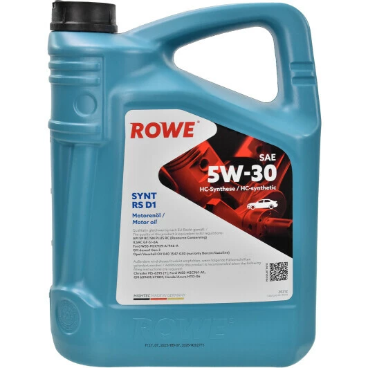 Синтетична моторна олива Rowe Synt RS D1 5w-30 спеціально розроблена з урахуванням вимог сучасних бензинових двигунів. Особливо вона підходить для моторів американського та японського виробництва, яким необхідна олива, яка відповідає специфікаціям ILSAC GF-5 і GF-6A з суворішими вимогами до захисту двигуна. Може також застосовуватися у двигунах, що працюють на етаноловому паливі (Е85).