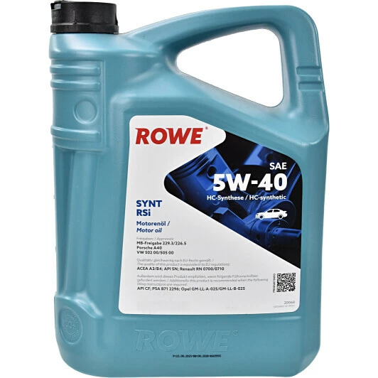 Rowe Synt RSi 5w-40 – це синтетична моторна олива, спеціально розроблена відповідно до вимог сучасних дизельних та бензинових двигунів (зокрема з турбонаддувом) без збільшеного інтервалу між замінами оливи. Може використовуватися в моторах, яким потрібна олива зі специфікаціями ACEA A3/B4 та API SN, CF. Крім того, продукт також отримав допуски від таких великих автовиробників, як Volkswagen, Porsche, Renault, Opel, PSA.