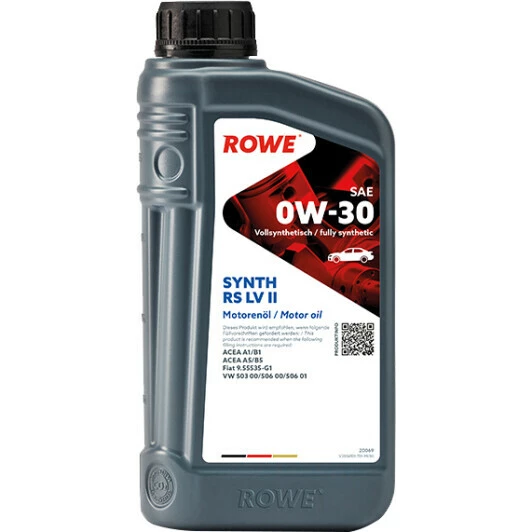 Rowe Synth RS LV II 0W-30 – це синтетична моторна олива, розроблена для сучасних бензинових і дизельних двигунів автомобілів концерну VAG (VW, Audi, Seat і Skoda). Особливо рекомендована для двигунів із технологією насос-форсунки (Pumpe-Düse), які потребують відповідності допуску VW 506 01. Також може застосовуватися в автомобілях, для яких передбачено подовження інтервалу заміни оливи.