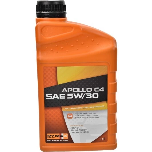 Rymax Apollo C4 5w-30 — повністю синтетична моторна олива, призначена для бензинових та дизельних двигунів легкових автомобілів та малотоннажних вантажівок. Розроблена спеціально для сучасних дизельних двигунів Renault. Вона відповідає вимогам специфікації RN0720 для автомобілів Renault та специфікаціям MB 229.31, MB 229.51 концерну Mercedes Benz, але також підходить і для двигунів авто інших виробників, яким рекомендовані оливи ACEA C4.
