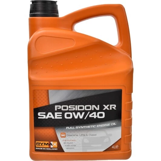 Rymax Posidon XR 0w-40 – синтетична моторна олива, спеціально розроблена для сучасних двигунів, зокрема з турбонаддувом, що працюють на бензині, дизелі або зрідженому газі (LPG). Може використовуватись у легкових та легких комерційних автомобілях, позашляховиках, фургонах, яким виробник рекомендує збільшений інтервал між замінами оливи.