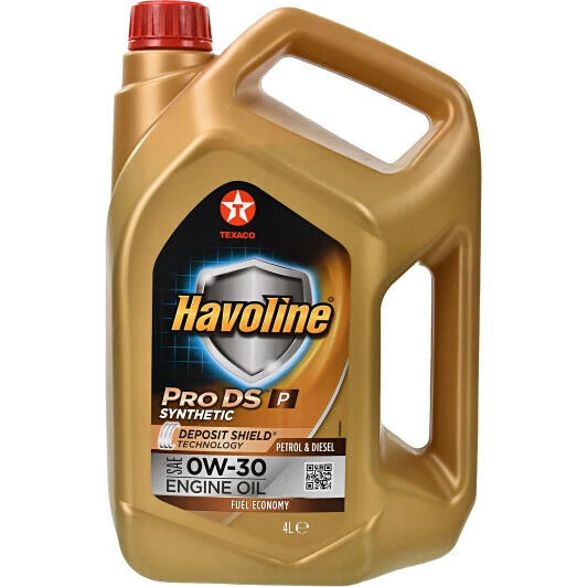Texaco Havoline ProDS P 0w-30 – повністю синтетична моторна олива преміум-класу, призначена для бензинових та дизельних двигунів (з турбонаддувом або без) легкових та легких комерційних автомобілів. Використовується також у моторах, що відповідають сучасним екологічним стандартам Євро 5 та 6. Підходить також для автомобілів, оснащених фільтром сажі для дизельних (DPF) та бензинових (GPF) двигунів.