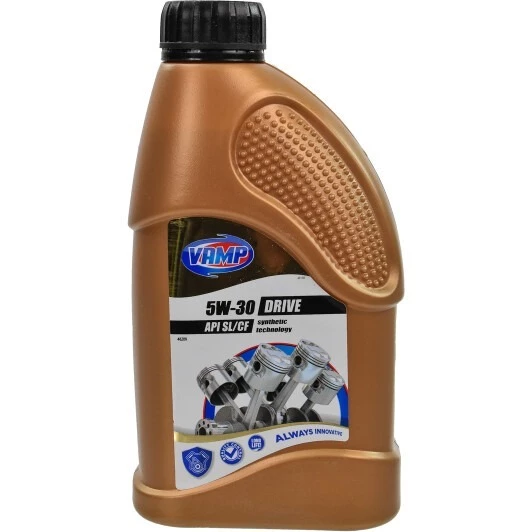 VAMP Drive 5W-30 моторна олива – продукт Черкаського заводу автохімії, призначений для двигунів легкових автомобілів, легковантажних фургонів, вантажівок. Ця моторна олива була розроблена для високообертових бензинових двигунів та дизельних двигунів з наддувом. Оптимально підібраний склад знижує тертя та захищає робочі пари двигуна від утворення відкладень.