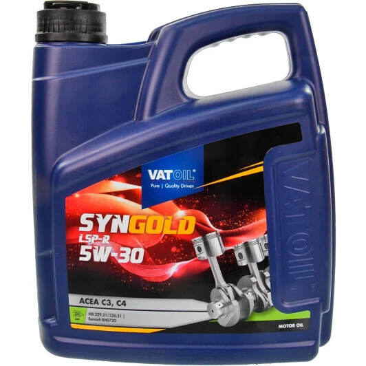 VatOil SynGold LSP-R 5w-30 – синтетична моторна олива з паливоощадними властивостями. Рекомендована для легкових автомобілів та фургонів зі збільшеним інтервалом між замінами оливи. Підходить для двигунів, які працюють на дизелі або бензині, із встановленим трикомпонентним каталітичним нейтралізатором або фільтром сажі.