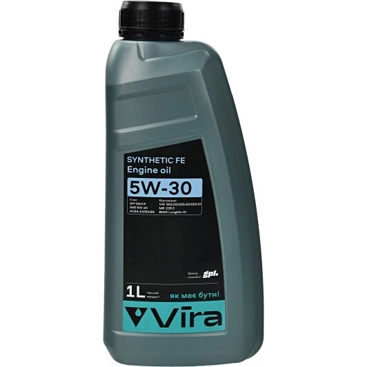 VIRA Synthetic FE 5w-30 – синтетична моторна олива, створена для забезпечення ефективної роботи сучасних бензинових та дизельних моторів, що експлуатуються у складних робочих умовах, включаючи їзду містом з частими пусками та зупинками. Може використовуватись у моторах, що працюють на газі. Підходить для використання у більшості сучасних легкових та легких комерційних автомобілів.