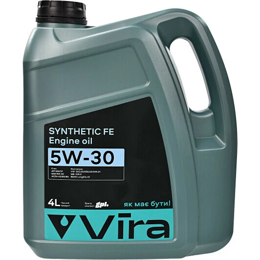 VIRA Synthetic FE 5w-30 – синтетична моторна олива, створена для забезпечення ефективної роботи сучасних бензинових та дизельних моторів, що експлуатуються у складних робочих умовах, включаючи їзду містом з частими пусками та зупинками. Може використовуватись у моторах, що працюють на газі. Підходить для використання у більшості сучасних легкових та легких комерційних автомобілів.