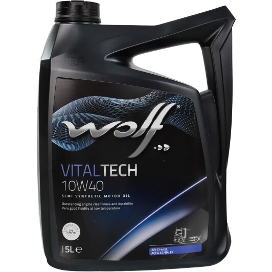 Wolf Vitaltech 10W-40 – напівсинтетична моторна олива, розроблена для дизельних двигунів комерційних автомобілів. Підходить для моторів, що відповідають екологічним стандартам Euro II та Euro III, зокрема двигунів із турбонаддувом та багатоклапанних без сажового фільтра (DPF)