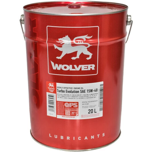 WOLVER Turbo Evolution 15W-40 – моторна олива, призначена для застосування у чотиритактних багатоклапанних бензинових двигунах з турбонаддувом та каталізатором, дизельних двигунах легкових авто та вантажівок з каталізаторами та турбонагнітачами. Ця олива відмінно показує себе в моторах легкої комерційної техніки, вантажівок, сільськогосподарської та кар'єрної техніки. Може використовуватися у двигунах із технологіями очищення вихлопних газів EGR та/або SCR.