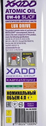 Моторна олива Xado Atomic Oil SL/CF 0W-40 синтетична - моторна олива екстра класу на основі комплексних синтетичних базових олив вищої якості. Високий рівень надійності, потужності і економічності завдяки формулі нанокомпонентів РЕВІТАЛІЗАНТ®, що входить до складу XADO Atomic Oil.
