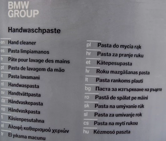 Очисник для рук БМВ Хандвашпасте ефективно видаляє зі шкіри рук фарбу, оливи, мастила, клей і багато іншого. Цей засіб можна використовувати навіть якщо немає води: просто обробіть ним руки, а потім витріть залишки пасти сухою серветкою або рушником.
