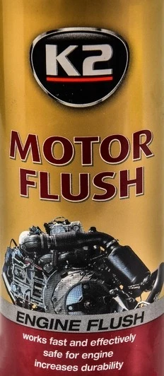 К2 Мотор Флаш промивка двигуна розчиняє найстаріші забруднення, які утворилися в системі змащення двигуна, на поверхнях циліндропоршневої групи, головці блоку циліндрів, піддоні. Видаляє сажу, оливний шлам, нагар, осад усередині двигуна. Склад безпечний для сальників, прокладок та інших ущільнювачів. Змащувальні присадки захищають деталі двигуна від надмірного тертя, при цьому двигун працює тихіше.